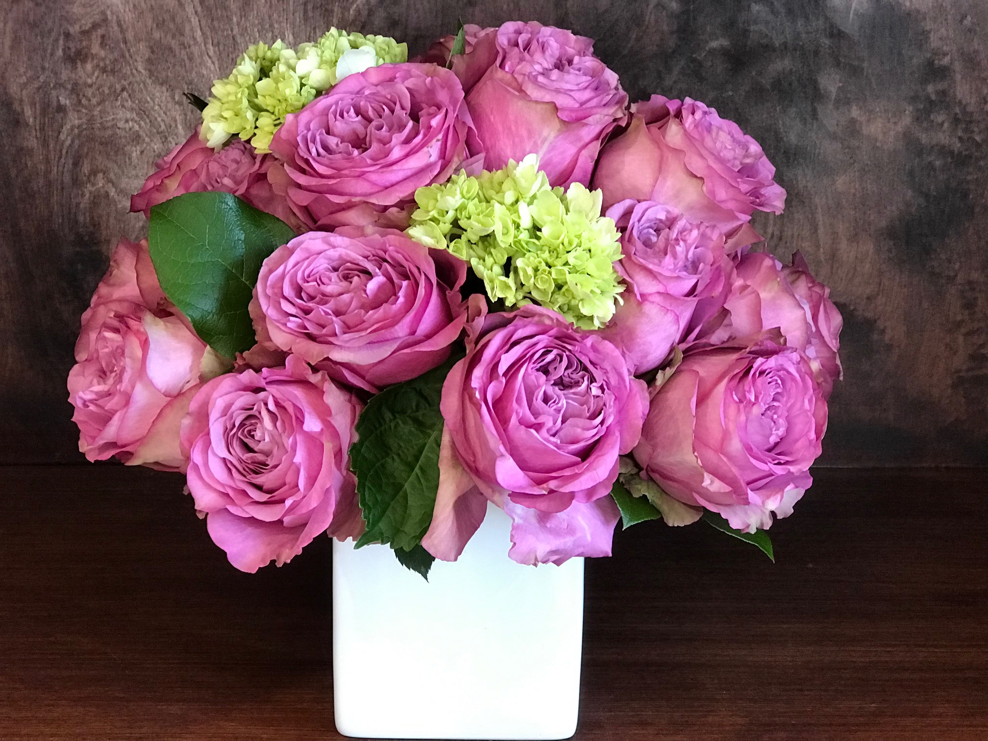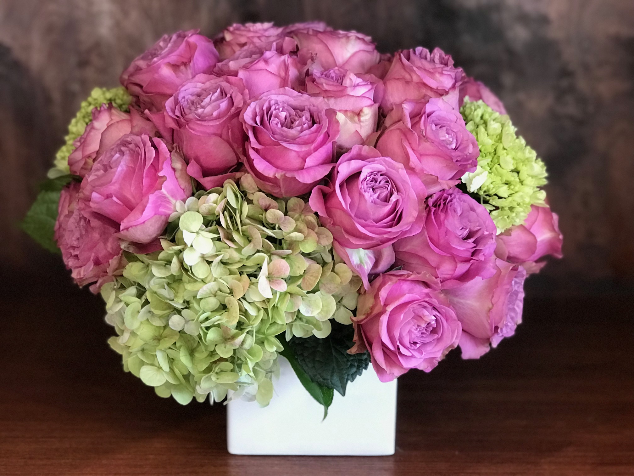 - Medium $345 3 Dozen lavender roses, 2 mini green hydrangeas, 1 antique green hydrangea and foliage mix