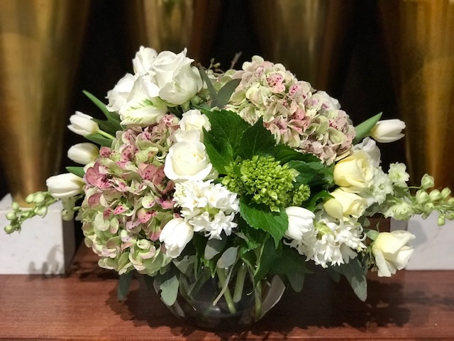 This sweet arrangement features stunning antique hydrangeas, mini green hydrangeas, white tulips, white roses, white delphinium and white pearl hyacinth. Designed with lush foliage mix in medium bubble bowl vase. Customize your container with ceramic, concrete, wood or metal. (seasonal stems may vary)
